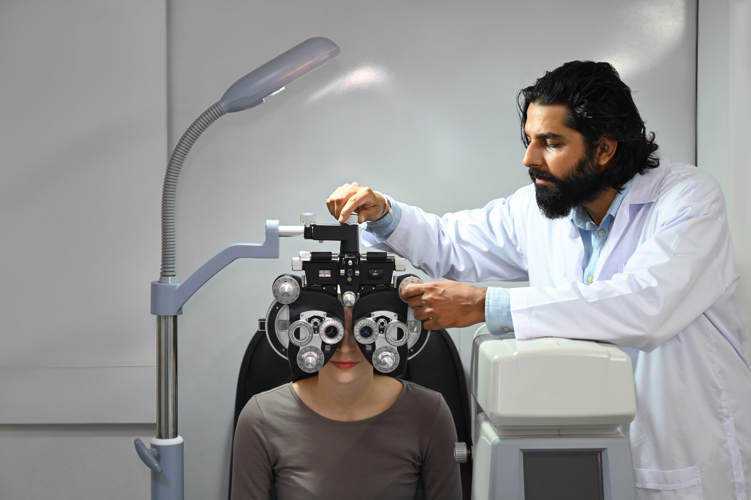 This test measures the prescription for eyeglasses or contact lenses. By using a phoropter (a device that contains different lenses), your eye doctor determines the exact prescription you need to correct your vision. It’s often done after a visual acuity test if you require corrective lenses.